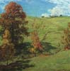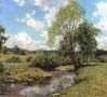 While his winter scenes provided him with great success, Metcalf was also well known for his work throughout the seasons. Included in this exhibition are such paintings as Green Idleness, which has a fresh and vivid palette indicating the transition from spring to summer, and Trout Brook, which depicts a likely spot for fly fishing. The Village--September Morning, Metcalf's only surviving painting of Plainfield, New Hampshire, presents a romanticized, archetypal New England village nestled among sheltering hills and steeped in nostalgic sentiment.