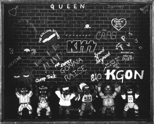 From top to bottom: David Gilhooly, My Dream! All Those Surrealists Were Just One Guy, 1997, assembladge, 24 x 20 x 6 inches, courtesy of the artist; David Gilhooly, Food Descending a Staircase, 1983, drypoint etching, 36 x 37 inches; David Gilhooly, The Village Turtles Perform "YMCA" in Front of the Rock'n Roll Wall of Fame, June, 1996, assemblage, 23.75 x 19.75 x 4 inches.
