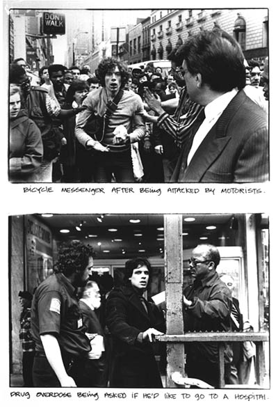 Images from top to bottom: Andrew Savulich, "External, Internal: Bicycle Messenger after Being Attacked by Motorists; Drug Overdose Being Asked if He'd Like to Go to Hospital," 1987/1981; gelatin silver print, Museum purchase with support from the FUNd; Lee Friedlander (American, born 1934), "Stamford, Connecticut, 1973," silver gelatin print, 11 x 14 inches. Museum Purchase.