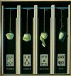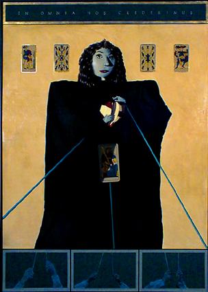 From top to bottom: In Omnia Nos Crederimus, 1997, acrylic with leaf on panels, 64.5 x 46 inches; Laetamur Graviora Passi, acrylic with leaf on panels, 63.75 x 48 inches; Originae, Finae, et Fatum, 1997, acrylic with leaf on panels, 48 x 48 inches; Casus Error Astudus Est, 1997, acrylic with leaf on panels, 48 x 49 inches; Memorbilia & Shadows, 1997, acrylic with leaf on panels, 41.5 x 49.5 inches.