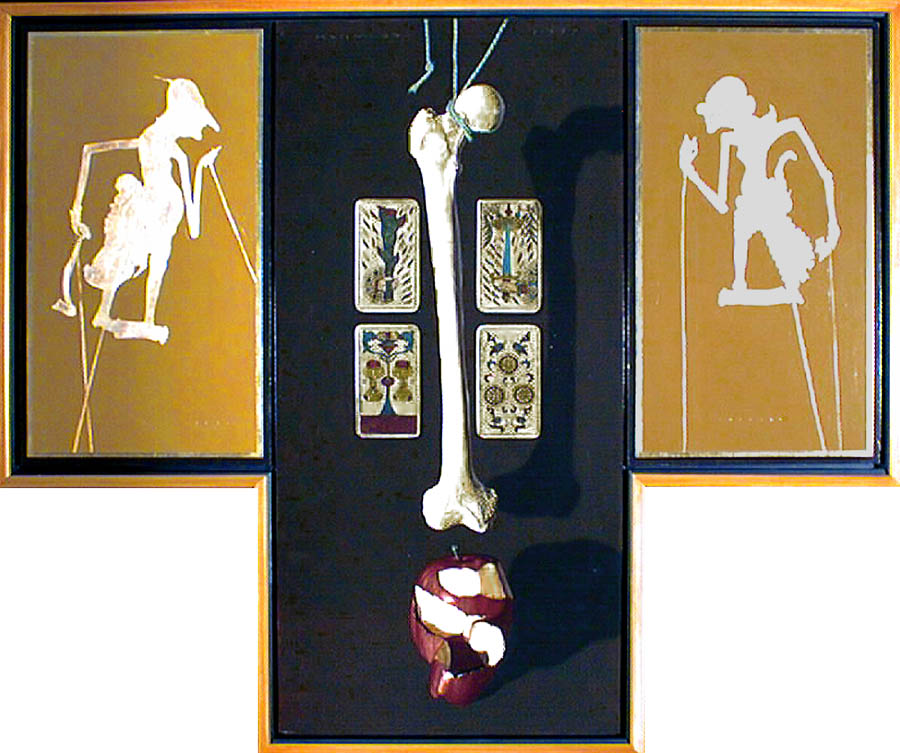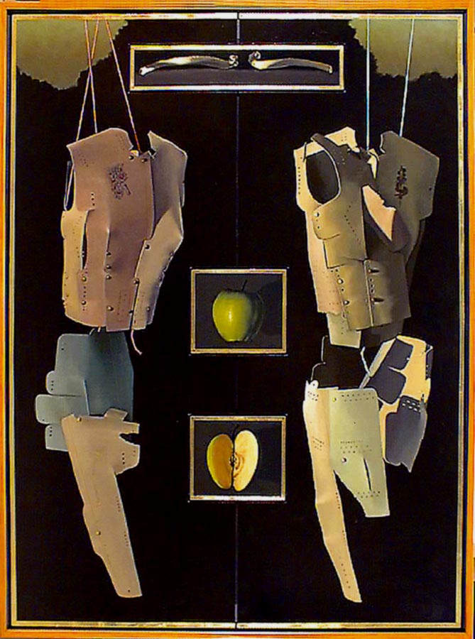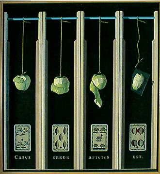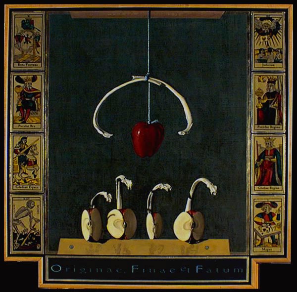 The exhibition is titled From the Apple to Eden: Paintings by Ben Mahmoud. It features realistic still-lifes of fruit, human bones and simple geometric forms framed by words and phrases in Latin. The starkly lit objects and lush colors are highlighted by trompe l'oleil (fool the eye) backgrounds. Gallery visitors frequently comment that the background fabric appears to be real, not painted.