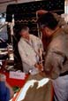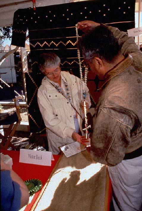 Scene from Annual Heard Museum Guild Indian Fair and Market. Pictured is Victor Beck, a noted Navajo jeweler, showing a visitor a silver necklace.