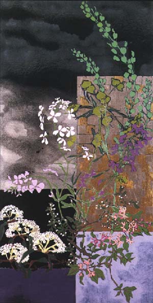 From top to bottom: Roberto Juarez, Valeriana, I997, Mixed media on canvas, 39 7/16 x 39 7/16 inches, Courtesy of Robert Miller Gallery, New York; Robert Kushner, Wild Phlox Bouquet, 1997, Oil, acrylic, wood, and palladium leaf on canvas, 60 x 30 inches, Courtesy of DC Moore Gallery, New York