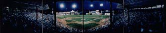 Using multiple color images taken with an 8 x 10 camera, Jim Dow creates highly detailed panoramas offering an unusual view of the ballparks as seen from a fan's point of view. Developed while photographing soccer stadiums in England and influenced by pioneering photographer Walker Evans, Dow's vision results in "astonishing, disturbing, and wholly unexpected" images of the empty spaces. "I have an old-fashioned, romantic approach to picture-making and architecture," Dow says. "But I'm not interested in making specimens, I'm interested in synthesizing an experience."