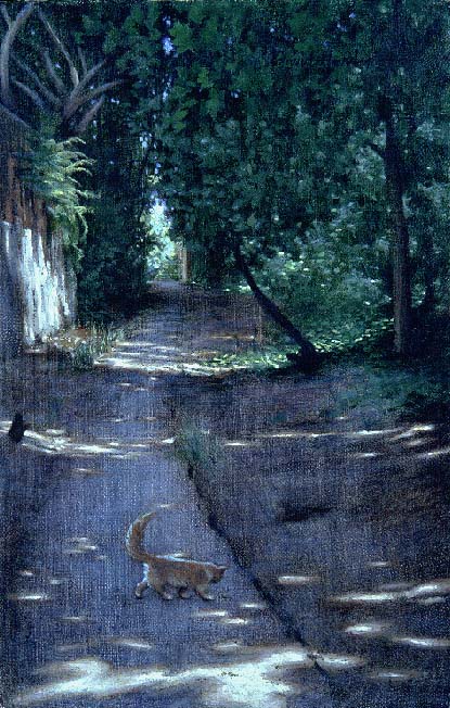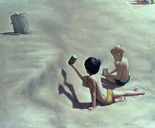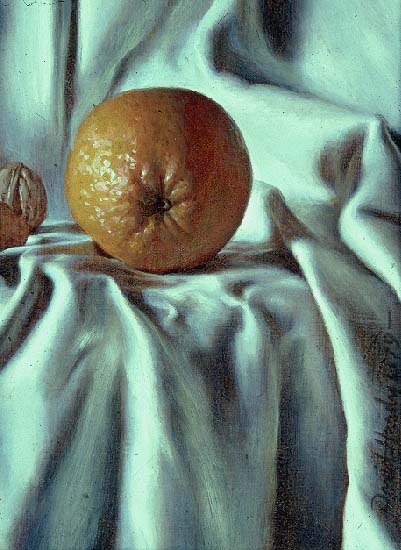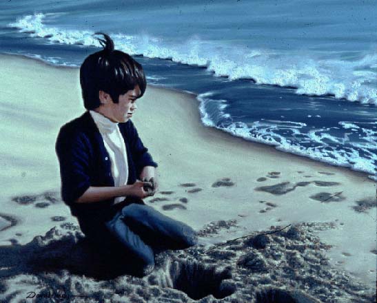 Images from left to right (all by David Hardy): "The Orange," oil on gesso panel, 9 x 12 inches, collection of Mr. & Mrs Peter Smith; "The World of the Buddha," oil on gesso panel, 9 x 12 inches, collection of Kay Oberbilling; "Kitty's Quest," oil on linen canvas, 9 x 14 inches, private collection; "California Sunset," oil on gesso panel, 36 x18 inches, collection of the artist; "Seabreeze," oil on linen canvas, 18"x 20 inches, private collection