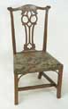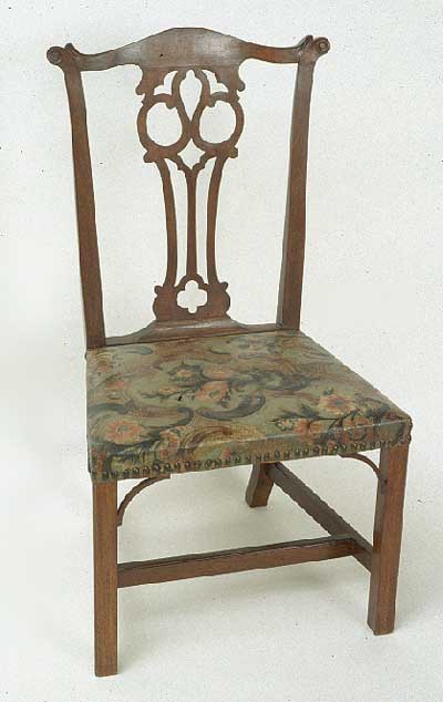 The Chippendale chair acquired by Lyman Allyn has a serpentine crest rail with carved scrolled ears above a pierced "owl's eyes" splat. The over-the-rail upholstered trapezoid seat is embellished with embossed, floral-patterned gilt or Spanish leather secured with oval-headed tacks. The molded Marlborough legs are joined by molded box stretchers. The finish on the mahogany is old, probably the original.