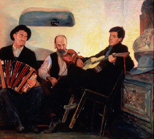 Bert Geer Phillips, Three Museucians of the Baile, c. 1920-21, oil on canvas, 40 x 43 inches, gift of Governor and Mrs. Arthur Seligman, 1929