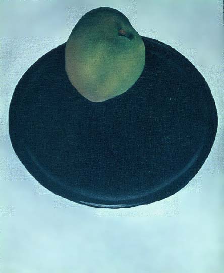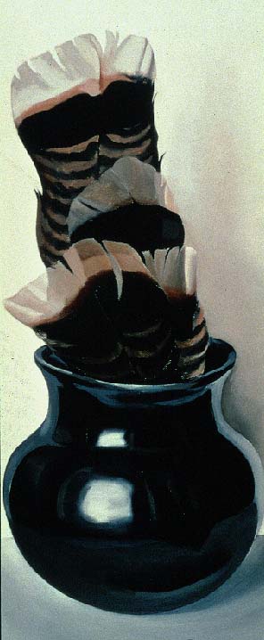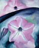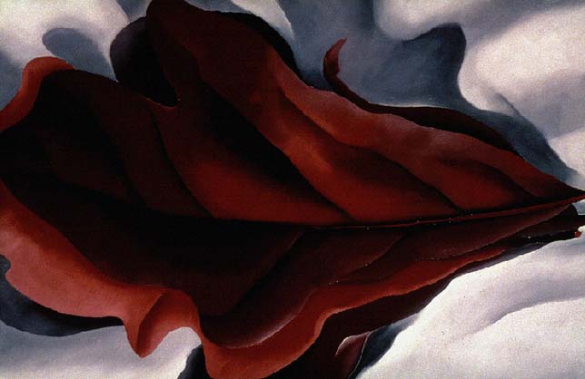 From top to bottom: Laura Gilpin, Georgia O'Keeffe, 1953, Amon Carter Museum, Fort Worth, Texas, Bequest of Laura Gilpin; Myron Wood, Recuerdos (Memories), 1981, Courtesy of Pikes Peak Library District; Georgia O'Keeffe, Turkey Feathers in Indian Pot, 1935, oil on canvas, Private collection; Georgia O'Keeffe, Slightly Open Clam Shell, 1926, pastel on paperboard, Curtis Galleries, Minneapolis, Minnesota; Georgia O'Keeffe, Large Dark Red Leaves on White, 1925, oil on canvas, The Phillips Collection, Washington, DC; Georgia O'Keeffe, Pelvis with Pedernal, 1943, oil on canvas, Munson-Williams-Proctor Institute Museum of Art, Utica, NY: 50.19; Georgia O'Keeffe, Black and Purple Petunias, 1925, oil on canvas, Maryellie Johnson; Georgia O'Keeffe, Petunia II, 1924, oil on canvas, The Georgia O'Keeffe Museum, Gift of the Burnett Foundation and Gerald and Kathleen Peters; Georgia O'Keeffe, Ladder to the Moon, 1958, oil on canvas, Collection of Emily Fisher Landau, New York; Georgia O'Keeffe, Green Apple on Black Plate, 1922, oil on canvas, Lent by the Birmingham Museum of Art, Birmingham, Alabama, Museum purchase with funds provided by the 1981-82 Beaux - Arts Committee, Museum Store, Donors, and matching funds from Mr. and Mrs. Jack McSpadden.