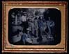After a few days in the city the new arrivals headed to the goldfields with clean clothes and new shovels as pictured in "Four Miners and the Town of Volcano, Amador County." When the dauguerreotypist caught up with them again they looked more like the hardworking men in "Miners in Rocky Stream Bed," "Group of Miners in a Ditch" or "Miners at Spanish Flat, El Dorado County."