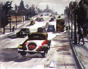 The California School of painting developed during the 1930s and 1940s, two decades most known for the Great Depression and World War II. Artistic vitality spread throughout the country as artists called out to each other to establish an American style of painting, one that focused on American subjects. Works Projects designed by the Federal Government to aid recovery from the Great Depression helped to stimulate artists in this effort. In California, these painters became prominent, gaining critical acclaim and national attention for their work in watercolor.