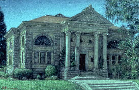 From top to botom: Still Life with Helmet Shell, 1992, oil on canvas, 18 x 22 inches; Still Life with Salt and Vinegar, 1994, oil on canvas, 16 x 22 inches; Carnegie Library Petaluma, CA, 1987, oil on canvas, 6 x 9 inches.
