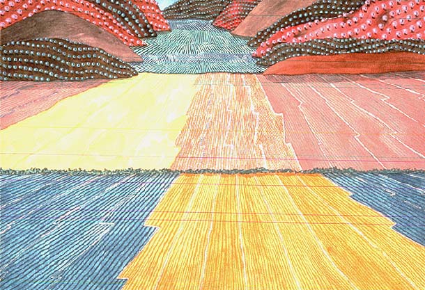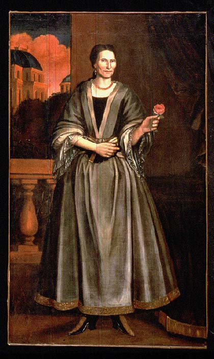 Top to bottom: attributed to Nehemiah Partridge, Ariantje Coeymans (Mrs. David Verplanck), 1718 or c. 1722-24, oil on canvas, 71 x 39 inches, original painted wood frame, 85 1/4 x 53 1/4 inches,bequest of Mrs. Gertrude Watson; Richard Callner, Red Fields, East of Madrid, 1988, watercolor and gouache on paper, 29 1/5 x 42 inches, AIHA Purchase.