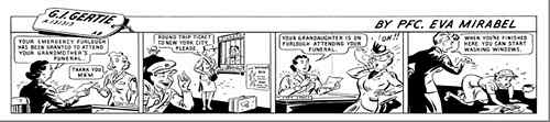 On May 6, 1943 Eva Mirabal enlisted in the Women's Army Corp and was stationed at Wright Field in Ohio. She was assigned to create a cartoon for WAC publications. Her character, G.I. Gertie, found herself in all the aspects and situations -often comedic-of military life. Eva's skill as a graphic artist was apparent and she was asked to continue with the character, as well as to create posters for US war bonds.