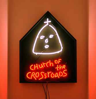 Church of the Crossroads, a neon installation by Renée Stout references the neon signs found on the facades of storefront churches. Church of the Crossroads is part of Stout's ongoing works that look at how people of African descent have created new meanings from intersections of Biblical texts and American and African belief systems.