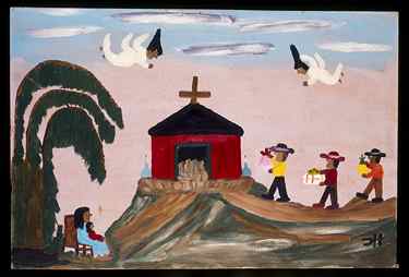Self-taught artist Clementine Hunter began to paint in the 1940s. Over the course of her prolific career, she is said to have created more than 4,000 works. Hunter took as her inspiration life on and around Melrose Plantation, south of Natchitoches, Louisiana, where she worked as well as lived in the African American community along the Cane River. Known for her genre scenes, Hunter also painted a considerable number of devotional scenes like Baby Jesus and Three Wise Men.