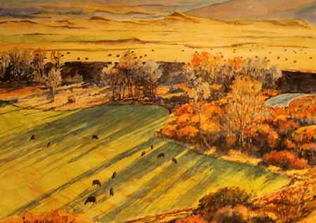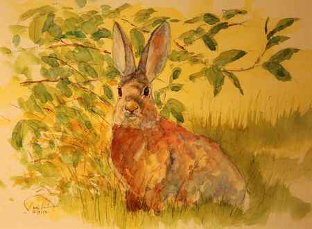 The exhibit is a compendium of watercolors by Paul Tunkis capturing the momentary presence of wildlife and the Montana landscape. "Wildlife is always in motion-stillness is fleeting. What does one see in three or four seconds? As an artist, I see the eyes, broad colors, the impression of life and its surroundings. A memory, a recollection of an encounter, not too much detail, just enough to suggest what I thought I saw, just enough to let you, the viewer, fill in the details from your own memories. The Montana landscape is constantly changing-the light fleeting and the weather unpredictable, the awe inspiring lasts only moments-capturing that special moment challenges the artist in me." says Tunkis. (right: Paul Tunkis, Cottontail, watercolor, 9 x12 inches)