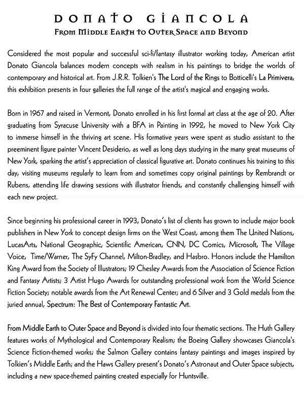 New York artist Donato Giancola balances modern concepts with realism in his paintings to bridge the worlds of contemporary and historical art. The Huntsville Museum of Art recently presented Donato Giancola: From Middle Earth to Outer Space and Beyond November 16, 2013 through January 19, 2014.