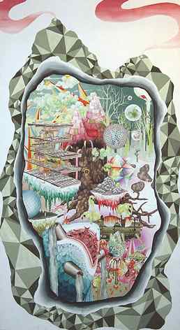 In Brethren of the Stone: Paul's Vision (Three Worlds Under a Mushroom Cloud Sky) (2006) New York based artist Jen Liu creates a futuristic fantasy world where nature and industry collide and intermingle. Adopting a format from traditional Chinese landscape painting, she creates a world within a world where elephants wear gas masks and smokestacks dance alongside smoking volcanoes. The title, which contains both religious and apocalyptic references, reveals the artist's belief that the fate of our environment involves both a religious and a material battle.