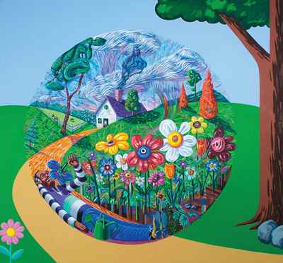 Peterson was born and raised in a quiet suburban neighborhood in central Florida, educated on the east coast, had a studio practice in Brooklyn for ten years, and relocated to Minnesota in 2011. This biography and geography, along with a sense of fantasy voyeurism inform many of his visual chronicles. Mining imagery from popular culture, science fiction, landscape painting, fairy tales, art history and comic books, Peterson creates candy-colored, fictional fantasy-filled narratives that are immediately inviting and playful. His cast of whimsical and quirky human and non-human characters, adorable pets, aliens, machines and amusing props interact within magical bucolic settings, calm oceanfronts before majestic mountain ranges, and otherworldly space-scapes. With a signature style and distinct mythology, ideas about family and relationships and childhood and maturity are core to his representational narrative and inventive storytelling.
