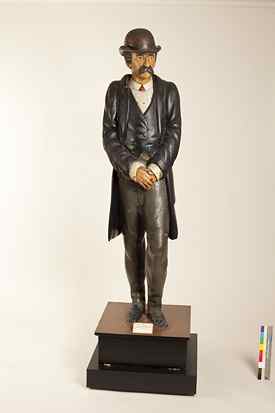 Three carved figures tell very different stories while providing sheer delight. Girl of the Period, made between 1870 and 1885 (attributed to the workshop of Samuel Robb), visually satirizes a type of vain female described by British anti-feminist Eliza Lynn Litton in an essay she wrote for the London Saturday Review: "a creature who dyes her hair and paints her face, as the first articles of her personal religion -- a creature whose sole idea of life is fun; whose sole aim is unbounded luxury; and whose dress is the chief object of such thought and intellect as she possesses." The carving, which stands 6' 6" tall and portrays a beautiful and curvaceous young woman who flaunts a cigar, is also an early example of the use of a woman's image in advertising. It is easy to envision her impact at the door of a 19th-century tobacconist's shop. An imaginative counterpart is a reference to a type of dandy defined by Booth Tarkington. The carving (made by an unidentified artist, 1885-1900) portrays a dude, a radically stylish and fastidiously dressed young urban male of the early 1880s. (The word "dude" is now synonymous with other male archetypes: ranch hands, cowboys, surfers, snowboarders, and a character immortalized by Jeff Bridges in The Big Lebowski (1998, Ethan Coen and Joel Coen). An enchanting, endearing elephant on view (c. 1882, attributed to the shop of Charles I.D. Looff), was once part of the carousel at Sulzer's Harlem River Park, located between 126th and 127th Streets and Second Avenue at the Harlem River -- one of New York's most popular entertainment venues in its day. (left: Possibly workshop of Samuel Robb (1851-1928), New York City, New York, Dude, c. 1885-1900, Paint on white pine, 84 3/4 x 26 x 26 inches. Photo courtesy of the Barbara L. Gordon Collection)