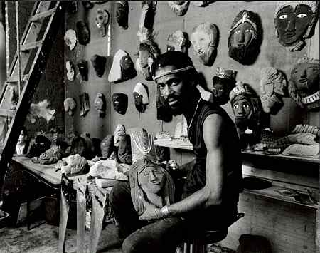 Born Gregory Warmack on March 30, 1948, in Maywood, Ill., a small African American community on Chicago's west side, he was the third of nine children and raised by his mother Margaret in a traditional Baptist home. She taught her children how to sing, and the family performed around Chicago as "The Warmack Singers." In the early 1960s the family relocated to Chicago's south side. Greg was sensitive and prone to seizures. He was bullied for carrying his Bible to school, so his mother withdrew him in the 9th grade. He was also artistic and credits his mother for encouraging him: "I knew I was an artist when I was real, real young. I don't really remember when I started drawing and making things, but it just seems like I was always doing it."[5] He painted religious subjects and signs, eventually receiving commissions from his church. By the time Greg was in his teens, he was on the street selling his handmade jewelry, carved wooden faces and painted rocks. After six years of working on his art, Warmack was ready to go "public." In spring 1978, he marched into a local newspaper office, with samples, to seek publicity for his jewelry. He was still living in his mother's overcrowded home, but he had already made a mini-museum of his art and collectibles. In the newspaper article that followed, Warmack announced his dream to sell enough jewelry to build an art center for black youths. He also had the prescient confidence to announce that "one day, the public and the nation will know about the work I'm doing."[6] Later that summer Warmack was robbed, shot in the stomach and left to die. While the surgeons operated, Warmack had an out-of-body experience in which he traveled through a tunnel of bright light. He would remain in a coma for six weeks. A myth arose that while Warmack was in the coma, he time-traveled to ancient Egyptian and African kingdoms and saw that he would become a world-famous artist. He acknowledged he had had a vision but that it was before the shooting. He glimpsed himself in a mirror dressed like an African king, prefiguring his artistic theme of self- deification. Furthermore, Warmack had always believed in his artistic gift. Like many survivors, his near death experience made him acutely aware of his mortality and propelled him into a fever of creativity and essentially reaffirmed that he had "special things to do."[7]