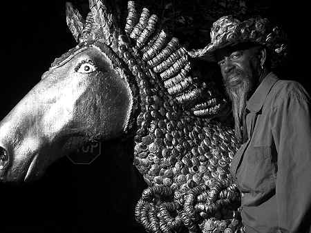 Mr. Imagination also began to invent his distinctive persona of a beneficent and visionary ruler, certainly a performance equal to the best of his creations. A decade later his concept would mature when he discovered new materials -- bottle caps fashioned into richly decorated thrones, staffs, clothing and jewelry, and paint brushes transformed into a kingdom of self-portraits and other characters. Dressed in full bottle cap regalia, Mr. Imagination entertained people and enjoyed the attention. One of his artistic goals was "to make people happy" and to heal them.[14] Sitting on Mr. Imagination's throne, wearing his hat and holding his staff, one felt like a king or queen, if only for a moment. Mr. Imagination's regal persona was "a means of delivering messages of self-empowerment, cultural pride, and the ability of art to transform lives."[15] Furthermore "his image of Egypt was subjective and metaphysical, and it played a significant role in the development of his sense of integrity and self-worth as an artist and an African American."[16]