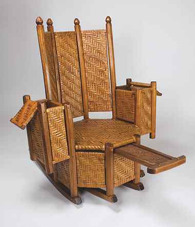 (above: Chester Cornett (1913-1981), Mayor's Chair, 1963, Black walnut and maple with hickory splinting. Collection of The Art Museum at UK. Created in 1963, this chair was commissioned by Willie Dawahare, then mayor of Hazard, Kentucky, as a gift for President John F. Kennedy, who was assassinated before it could be delivered. Now known as the Mayor's Chair, it is sheathed in hickory bark splinting that is woven like a basket. The armrests feature lidded containers, and a pullout footrest slides in and out from beneath the seat.)