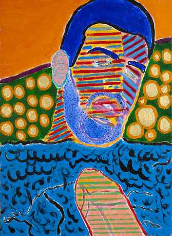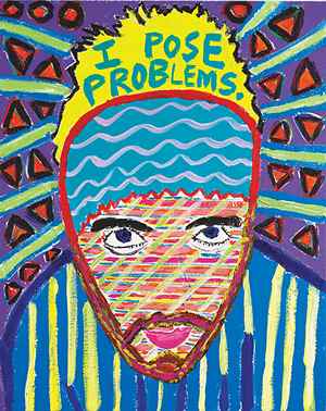 An acclaimed author and educator, Wayne Koestenbaum has examined subjects including Andy Warhol, Jackie Onassis, Harpo Marx, opera, fashion, desire, and humiliation. In 2010, he took up the paintbrush, and, since then, has produced hundreds of canvases of male portraits and nudes, landscapes, and dense abstractions rife with meandering lines, riotous corange benolors, and suggestive iconography. One work features a male head looking straight at the viewer with the phrase "I pose problems" written above. This may be true of Koestenbaum's creative output in art and literature, but it must also be said that he offers outrageously complex and candid revelations about the self and society. (right: Wayne Koestenbaum, I Pose Problems, 2010, acrylic on canvas, courtesy of the artist)