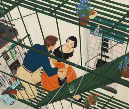 With dramatic perspective, bold color blocks, and eye-catching patterns, Conner's illustrations exude an impeccable sense of style and capture ideals of female beauty, comportment, and romance that Betty Friedan later famously -- and critically -- labeled "The Feminine Mystique." The themes presented in his work mirror the perspectives of the publications of the day and of their readership, with an emphasis on glamour, family values, and youth. The sophisticated, beautiful women in the illustrations are often depicted as the principal players, with men taking supporting roles.