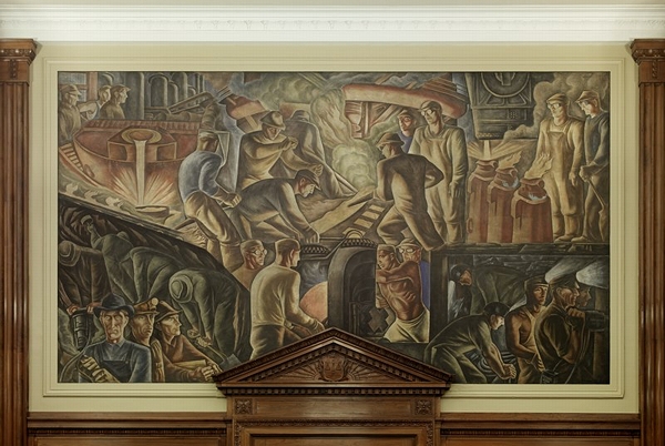 (above: Howard Cook, Steel Industry, c. 1936, fresco, 10' 6" x 17' 6", U.S. Courthouse and Post Office, Pittsburgh, Pennsylvania, photographs in the Carol M. Highsmith Archive, Library of Congress, Prints and Photographs Division, Forms part of the Carol M. Highsmith Archive. Public domain, via Wikimedia Commons*)