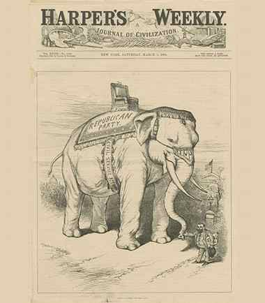 Although lacking formal education, Nast's imagery included identifiable caricatures, scathing satire, and creative references to Shakespearean tales and Greek mythology. Nast's representation of the donkey and elephant as symbols for the Democratic and Republican parties, respectively, continues to endure more than a century later.