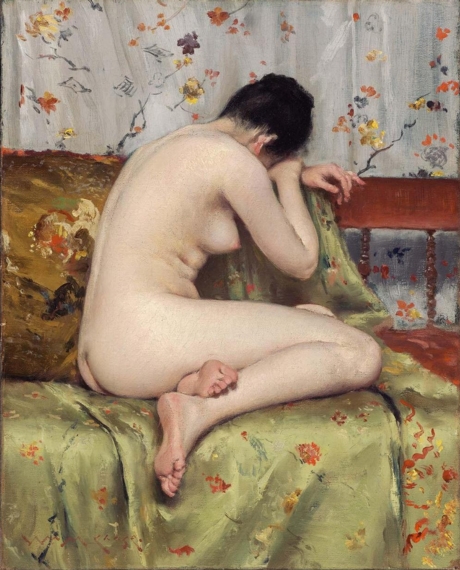 (above: William Merritt Chase, A Modern Magdalen, c. 1888, oil on canvas, 19 x 15.5 inches, Museum of Fine Arts, Boston, Museum purchase with funds by exchange from a Bequest of Susan Greene Dexter in memory of Charles and Martha Babcock Amory, Gift of Mrs. Albert J. Beveridge, and the Robert Jordan Fund, 2007.7. Public domain, via Wikimedia Commons*)