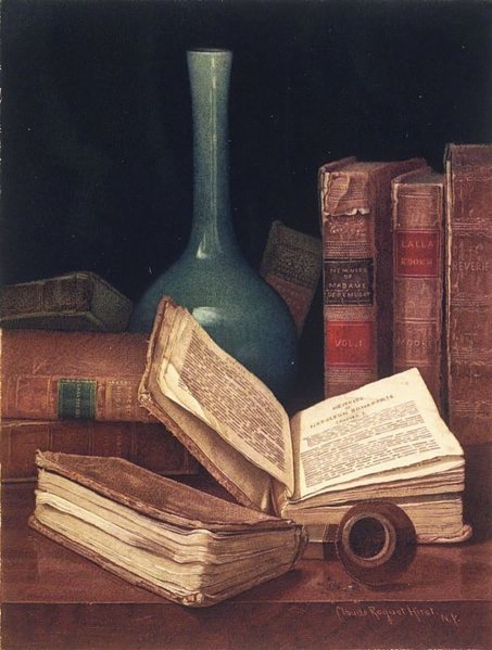 (above: Claude Raguet Hirst, The Bookworm's Table, c. 1890, watercolor over graphite on cream, moderately thick, rough-textured wove paper, 12.5 x 9.4 inches, Brooklyn Museum, designated Purchase Fund, 80.79. Public domain, via Wikimedia Commons*)