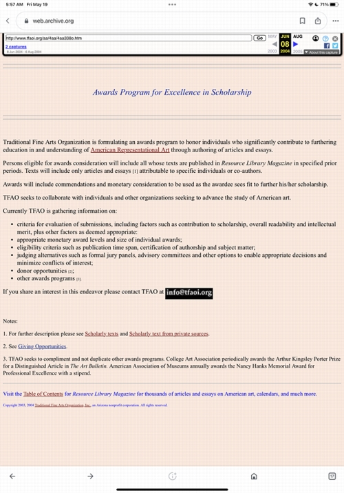 Links to sources of information outside of our web site are provided only as referrals for your further consideration. Please use due diligence in judging the quality of information contained in these and all other web sites. Information from linked sources may be inaccurate or out of date. TFAO neither recommends or endorses these referenced organizations. Although TFAO includes links to other web sites, it takes no responsibility for the content or information contained on those other sites, nor exerts any editorial or other control over them. For more information on evaluating web pages see TFAO's General Resources section in Online Resources for Collectors and Students of Art History.