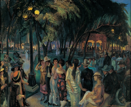 John Sloan, 1871-1951, Music in the Plaza (Plaza, Evening, Santa Fe), 1920, oil on canvas, New Mexico Museum of Art. Gift of Mrs. Cyrus McCormick, 1952, 326.23P. Public domain, via Wikimedia Commons*)