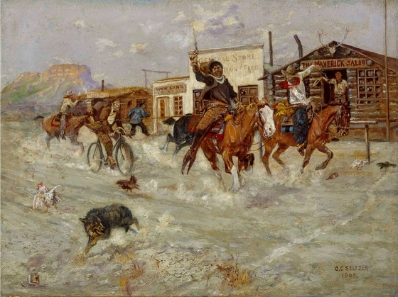 (above: Olaf Carl Seltzer, A Dude's Welcome, 1909, oil on canvas,17 1/4 x 23 1/2 inches, Denver Art Museum, The Roath Collection, 2013.93)