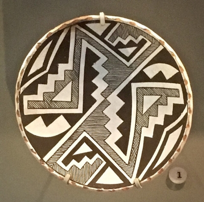 (above: Lucy Lewis, Small decorative plate with a classic Chaco-style design. On display at Museum of Northern Arizona, Flagstaff. Public domain, via Wikimedia Commons*)
