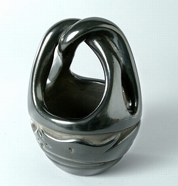 (above: Black-on-black pot crafted by Merton and Linda Sisneros of Santa Clara Pueblo, featuring kiva steps (top left), feathers (top right), and Avanyu, spirit of water (bottom). From a private collection.. Photo courtesy of Kenrossalex. Public domain, via Wikimedia Commons**)