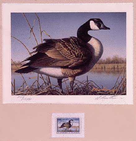 The first Federal Duck Stamp - designed at President Roosevelt's request by Jay "Ding" Darling, a nationally known political cartoonist for the Des Moines Register and a noted hunter and wildlife conservationist - depicts two mallards about to land on a marsh pond. In subsequent years, noted wildlife artists were asked to submit designs until 1949 when the first contest was opened to any U.S. artist who wished to enter. To select each year's design, a panel of noted art, waterfowl, and philatelic authorities are appointed by the Secretary of the Interior. Winners receive no compensation for the work except a pane of their stamps, but are allowed to sell prints of their designs, which are eagerly sought by hunters, conservationists, and art collectors.