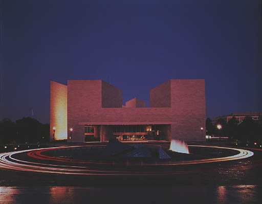 Photos from left to right: View of the West Building of the National Gallery of Art (1941) Looking East Towards the U.S. Capitol along Constitution Avenue, NW, photo by Dennis Brack / Black Star; After Dark: View of the East Building from the West Building, Fourth Street Entrance, Opened 1978, Architect: I. M. Pei & Partners, photo by Dennis Brack / Black Star; Interior of East Building atrium of National Gallery of Art, featuring Alexander Calder mobile; photo: John Hazeltine, ©1987
