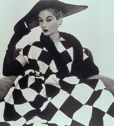 models isolated against stark surfaces. Harlequin Dress (1950), illustrates