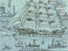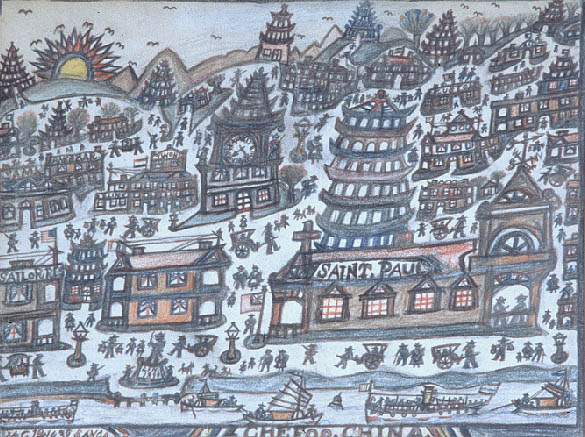 Golding's fanciful color drawings primarily depict ships he had seen or served on, and views of exotic ports. His images range from views of the Savannah harbor to scenes of sailing ships chasing whales in the Arctic, South Seas ports featuring erupting volcanoes, and remembered renditions of Chinese architecture. Golding's work relates not only to maritime painting but also to the phenomenon of memory painting in self-taught art.