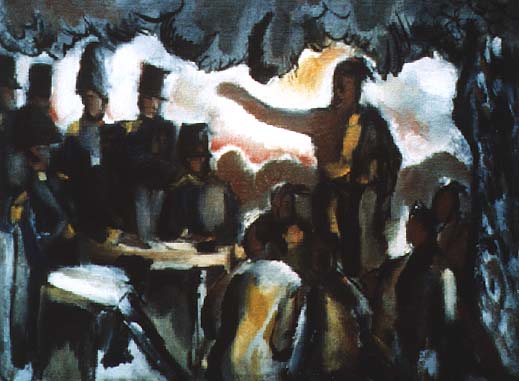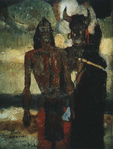 In 1918 he began An Imaginary History of the West, an important series of abstract figure paintings. From the austere "PowWow" to the grisly humor of "Bar Room Fight," the expressive "Combat," this series of thirty small, jewel-like paintings captures the romance of the West and the imaginations of young and old alike. For exhibit dates please call the Taylor Museum.