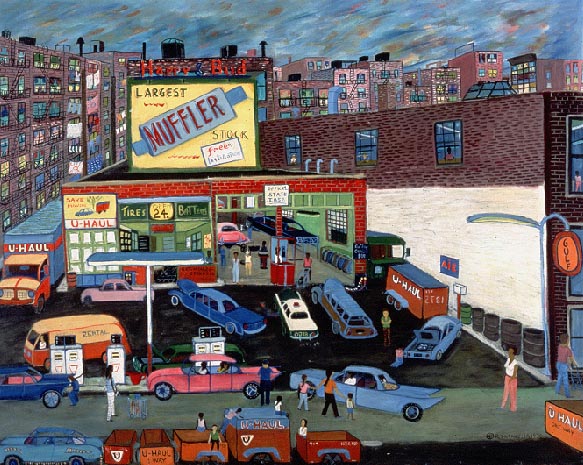 10, 2000. (left: Happy and Bud Service Station, 1970, oil