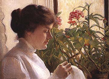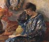 Left to right: Robert Henri, Tam Gan, 1914, oil on canvas, 24 x 20 inches, Collection of Allbright-Knox Art Gallery, Buffalo, New York, Sarah A.Gates Fund, 1915; Robert Henri, The Beach Hat, 1914, oil on canvas, 20 x 16 inches, Collection of The Detroit Institute of Arts, City of Detroit Purchase; Edmund Tarbell, Josephine Knitting, 1916, oil on canvas, 26 1/4 x 20 1.4 inches, Collection of the Corcoran Gallery of Art, Bequest of George M. Oyster, Jr.; Donna Schuster, Woman Sewing, 1909, oil on canvas, 26 1/4 x 30 1/4 inches, Collection of John and Brenda Watkins
