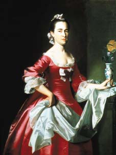The numerous portraits reflect the importance of portraiture as the surest path to success for these early artists. John Singleton Copley's Mrs. George Watson (1765) shows a merchant's wife in colonial Boston, with a lavish lace-trimmed dress, imported vase and exotic parrot tulip. Copley portrays Mrs. Watson as a fine British gentlewoman living in a colonial outpost. (right: John Singleton Copley (1738-1815), Mrs. George Watson, 1765, oil on canvas, 49 7/8 x 40 inches, The Smithsonian American Art Museum, Partial gift of Henderson Inches, Jr., in honor of his parents, Mr. and Mrs. Inches, and museum purchase made possible in part by Mr. and Mrs. R. Crosby Kemper through the Crosby Kemper Foundation; the American Art Forum; and the Luisita L., and Franz H. Denghausen Endowment)