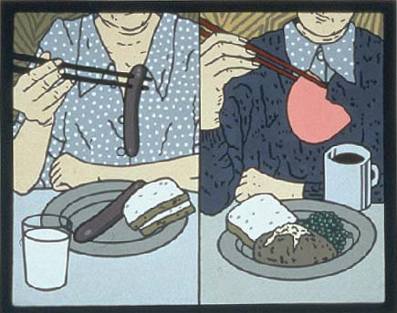 30 recent paintings and 10 prints by Roger Shimomura, provides an intimate