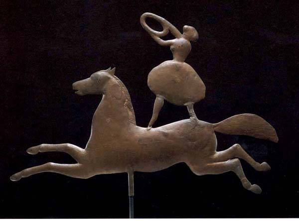 left: Anonymous, Circus Equestrienne Weathervane, c. 1885. Gilded