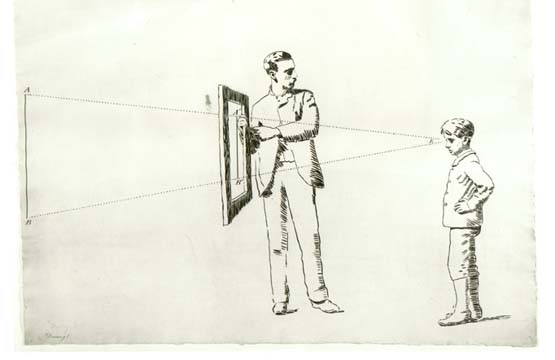 In his teaching career, the "elder mentor" Eakins carefully explained his perspective theories to students in lectures at the Academy, and even wrote a drawing manual that included lessons on perspective, mechanical drawing, reflections, refraction, and the construction of a basic camera. Drawing I: The Law of Perspective, an illustration for this unpublished manual, demonstrates the concept of the "cone of vision." By measuring the line AB, and combining this information with the distance of the viewer from the picture, the student could determine the length of A'B' in the perspective drawing. Eakins continued to make perspective drawings for his paintings until the end of his life, plotting his own signature in perspective according to the special proportional formulae relevant to each canvas. An Actress (Portrait of Suzanne Santje): Plan and Perspective Study of the Artist's Signature dates from 1903, towards the end of Eakins' career. In 1907, he painted his Last full-length portrait -- for which there are no less than six perspectival drawings. The artist died in 1916.