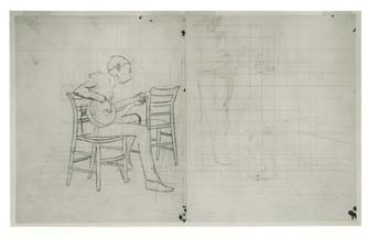 While Eakins continued to use drawing to record his observations and experiments throughout his career, he seems to have entirely shifted the focus of his more artful studies to oil as early as 1867. This was Eakins' second of three years studying at the École des Beaux-Arts in Paris under Jean-Léon Gérôme, an education that required daily study from the nude model. By the time Eakins left Paris in 1870, he had turned from drawing to painting as his primary medium. Figure Study: Masked Nude is typical of the oil sketches the artist practiced and recommended for students. For the rest of his career, Eakins would make oil sketches to practice gesture, color, tone, and texture. Despite his belief that life study was best undertaken with oil paint and brush, Eakins never abandoned drawing. Rather, in his mature career, the artist used drawing for dissection studies as we have seen, and in his continued perspectival preparations. Negro Boy Dancing: Perspective Drawing is a typical example of Eakins' "project" drawings. In preparation for finished works, like his 1878 watercolor depicting an African-American "dancing lesson," the artist executed perspective drawings to plan spatial effects. Annotations on the drawing allow full understanding of the artist's perspectival scheme. According to Eakins scholar Kathleen Foster, "the annotations clearly state that the horizon is forty-eight inches, the viewing distance four feet, width of the scene eight feet, and that the standing man and dancing boy are five feet, seven inches and three feet, eleven inches tall, respectively"[i] From these annotations, we learn that Eakins still found measurement of his subjects and pictorial spaces important, as he did in his mechanical drawing exercises sixteen years earlier, and that he positioned himself, and the viewer, as participants in the scene. At a horizon (or eye level) of 48 inches, Eakins placed his eye at the height of two other figures in the scene -- the guitar player and dancer -- who perform under the watchful eye of an elder mentor.